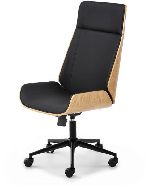 Irodai forgófotel – praktikus és stílusos bútordarab irodába és otthonra Az AUSTIN irodai forgófotel  stílusos és ergonomikus megoldás, amely ideális otthoni dolgozószobába, irodába vagy recepcióra. Modern kialakítása ötvözi a kényelmet és az eleganciát, így tökéletesen illeszkedik mind professzionális, mind otthoni környezetbe. Kialakított háttámlája és állítható magassága hosszú órákon át is kényelmes ülést biztosít. Masszív szerkezete és a görgők lehetővé teszik a könnyed mozgást, ezzel növelve a szék funkcionalitását. Az AUSTIN tökéletes választás mindazok számára, akik értékelik az esztétikát és a munkakényelmet. A szék fő előnyei:Diófa hatású furnérkorpusFekete ökobőr kárpitozásÁllítható magasságTILT hintamechanikaKaucsuk bevonatú görgőkElegáns és modern irodai forgófotel állítható magassággal Az AUSTIN forgószék kiválóan illik modern és skandináv stílusú enteriőrökbe. A fekete kárpit és a természetes fa kombinációja egyszerre minimalista és otthonos hatást kelt. Letisztult formája és visszafogott színei remekül harmonizálnak világos terekben és egyszerű berendezéssel. A fém talp enyhe ipari jelleget kölcsönöz, ami jól illeszkedik modern munkakörnyezetekhez. Fekete ekobőr kárpitozás A fekete kárpit kiváló minőségű ekobőrből készült, amely egyszerre elegáns és könnyen tisztítható. Kopásálló felülete ideálissá teszi irodai vagy otthoni használatra egyaránt. Puha tapintása hosszú ülés közben is kényelmet nyújt. Mély fekete színe professzionális megjelenést kölcsönöz a térnek. Masszív, fekete fém talp A szék lábcsillaga fekete, porszórt acélból készült, ami hosszú távon biztosítja a stabilitást és a tartósságot. Karcsú formája könnyedséget visz a designba, miközben garantálja a biztonságos használatot. A forgó görgők növelik a mozgás szabadságát. Tölgy furnérozott korpusz ergonomikus kialakítással A szék váza hajlított rétegelt lemezből készült tölgy furnérral, amely természetes melegséget és otthonos jelleget visz a térbe. A fa erezete kiemeli az anyag valódi szépségét. A hajlított fa egyszerre könnyed és tartós, valamint ergonomikus támaszt biztosít. Magasságállítás – személyre szabott kényelem Az AUSTIN fotel magassága egyszerűen állítható a felhasználó igényei szerint. A kar segítségével a beállítás gyors és kényelmes, így különböző magasságú asztalokhoz is illeszkedik. TILT hintamechanika A TILT mechanizmus lehetővé teszi, hogy az ülés és a háttámla együtt dőljön hátra, ezzel enyhítve a gerinc terhelését és elősegítve a pihenést munka közben. A dőlésszög rögzíthető, a rugóerő pedig személyre szabható. Kaucsuk bevonatú görgők A puha görgők csendes és sima mozgást biztosítanak, miközben óvják a padlót a karcolásoktól. Parkettához, laminált padlóhoz és járólaphoz egyaránt biztonságosak. Az AUSTIN forgószék méretei:Teljes magasság: 108–118 cmTeljes szélesség: 60 cmTeljes mélység: 60 cmÜlésmagasság: 45–55 cmKülső ülésmagasság: 55–65 cmÜlésszélesség: 55 cmÜlésmélység: 43 cmHáttámla magassága: 66 cmHáttámla szélessége: 45 cm
