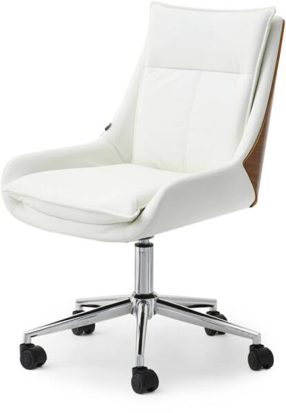 LEON bőrhatású irodai forgófotel – elegancia és kényelem egybenA LEON irodai fotel a modern dizájnt ötvözi a mindennapi kényelemmel. Letisztult formavilága és praktikus kialakítása miatt tökéletes választás otthoni irodába, dolgozószobába vagy akár ifjúsági szobába is. Stílusos megjelenése és ergonomikus felépítése garantálja, hogy munka vagy tanulás közben mindig kényelmesen üljön. A fotel legfontosabb jellemzőikarfa nélküli, praktikus kialakítás a szabadabb mozgásért, korpusz elegáns, hajlított, dió furnérozott rétegelt lemezből, krémszínű, ekobőr kárpitozás az ülőlapon és a háttámlán, krómozott, fémből készült, stabil lábcsillag, görgők a könnyű és csendes mozgatáshoz, magasságban állítható ülőrész a személyre szabott kényelemért. Elegáns és időtálló dizájnA LEON forgófotel megjelenése egyszerre modern és klasszikus. A dió színű fa elemek természetes melegséget sugároznak, míg a krémszínű ekobőr és a krómozott lábcsillag elegáns, minimalista összhatást kelt. Ez a stílusos kombináció bármilyen belső térben harmonikusan mutat – legyen szó skandináv, loft vagy letisztult, modern enteriörről. Kényelem, amelyre minden nap számíthatA puha, ekobőrrel bevont ülőfelület és háttámla megfelelő tartást biztosít a hosszabb munkanapok során is. A bőrhatású kárpit nemcsak elegáns, hanem rendkívül könnyen tisztán tartható, így fotelje mindig ápolt és újszerű marad. Stabilitás és funkcionalitásA masszív, krómozott lábcsillag öt görgője biztosítja a stabil tartást és a könnyű mozgathatóságot. Az állítható magasság lehetővé teszi, hogy a fotelt mindig az Ön testmagasságához és asztalához igazítsa, elősegítve a helyes testtartást és a komfortos munkavégzést. MéretekTeljes szélesség: 62,5 cmTeljes mélység: 68 cmTeljes magasság (minimum): 89 cmTeljes magasság (maximum): 99 cmÜlőfelület szélessége (belül): 42 cmÜlőfelület szélessége (kívül): 55 cmÜlőfelület mélysége: 45 cmÜlőfelület magassága (minimum): 48 cmÜlőfelület magassága (maximum): 58 cmHáttámla szélessége: 50 cmHáttámla magassága: 44 cmMagasságállítási tartomány: 10 cmA LEON irodai forgófotel nemcsak kényelmes munkaeszköz, hanem otthona vagy irodája elegáns dísze is. Válassza a praktikum és a stílus tökéletes kombinációját!
